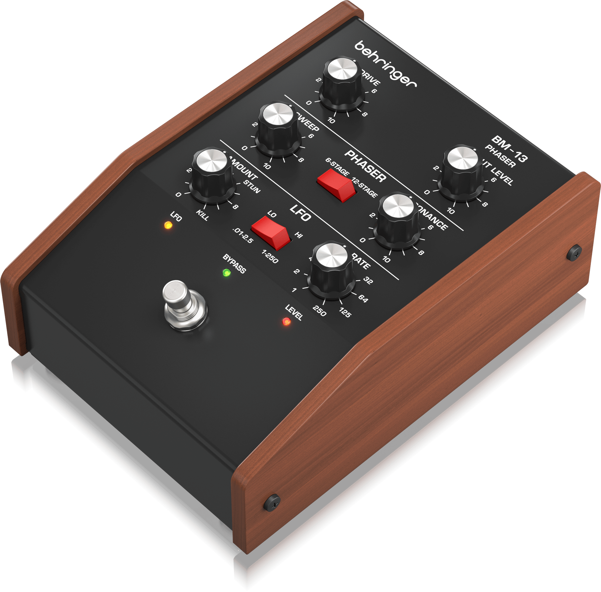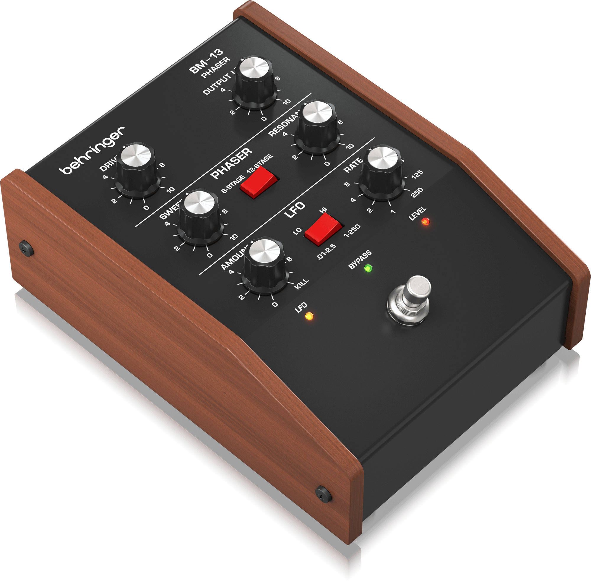 BM-13 PHASEはSWEEPやRESONANCEなど多数のコントロールを備えており、思うままサウンドを作り上げることができます。LFOを0.01Hzまで下げれば、非常にゆっくりなフェイザーサウンドを得ることができますし、逆に250Hzまで上げれば、スパイシーな波打つようなフェイザーサウンドを得ることができます。6ステージまたは12ステージを切り替えることで、サウンドのフレーバーを大幅に変更できます。
