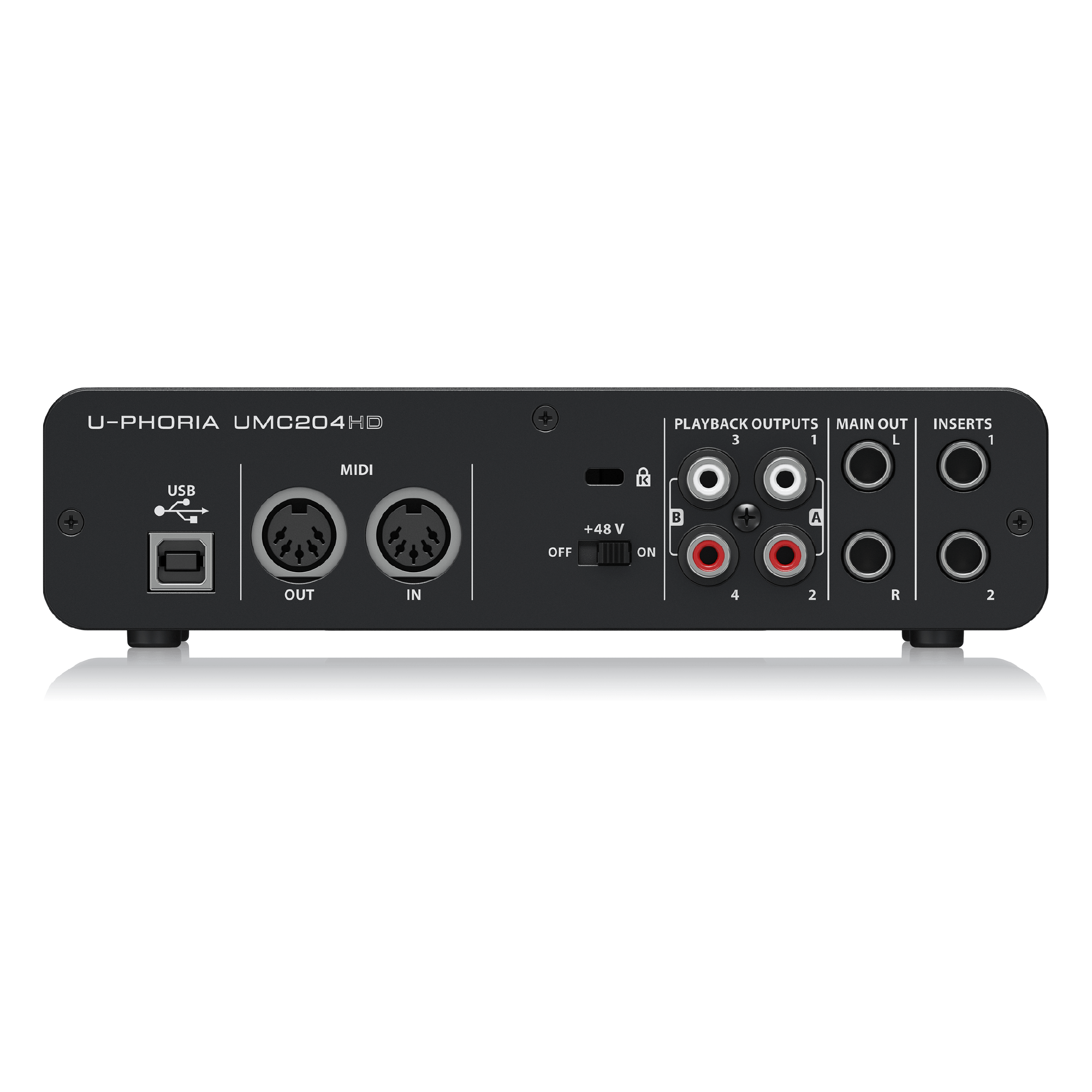 UMC204HD のリアパネルには、コンピューターと簡単に接続できる USB 2.0 ポートのほか、¼" TRS 出力、RCA出力など豊富な端子を搭載。また外部エフェクト用のINSERT端子も備えています。MIDI I/OによりMIDIキーボードやお好みのMIDIデバイスを接続できます。