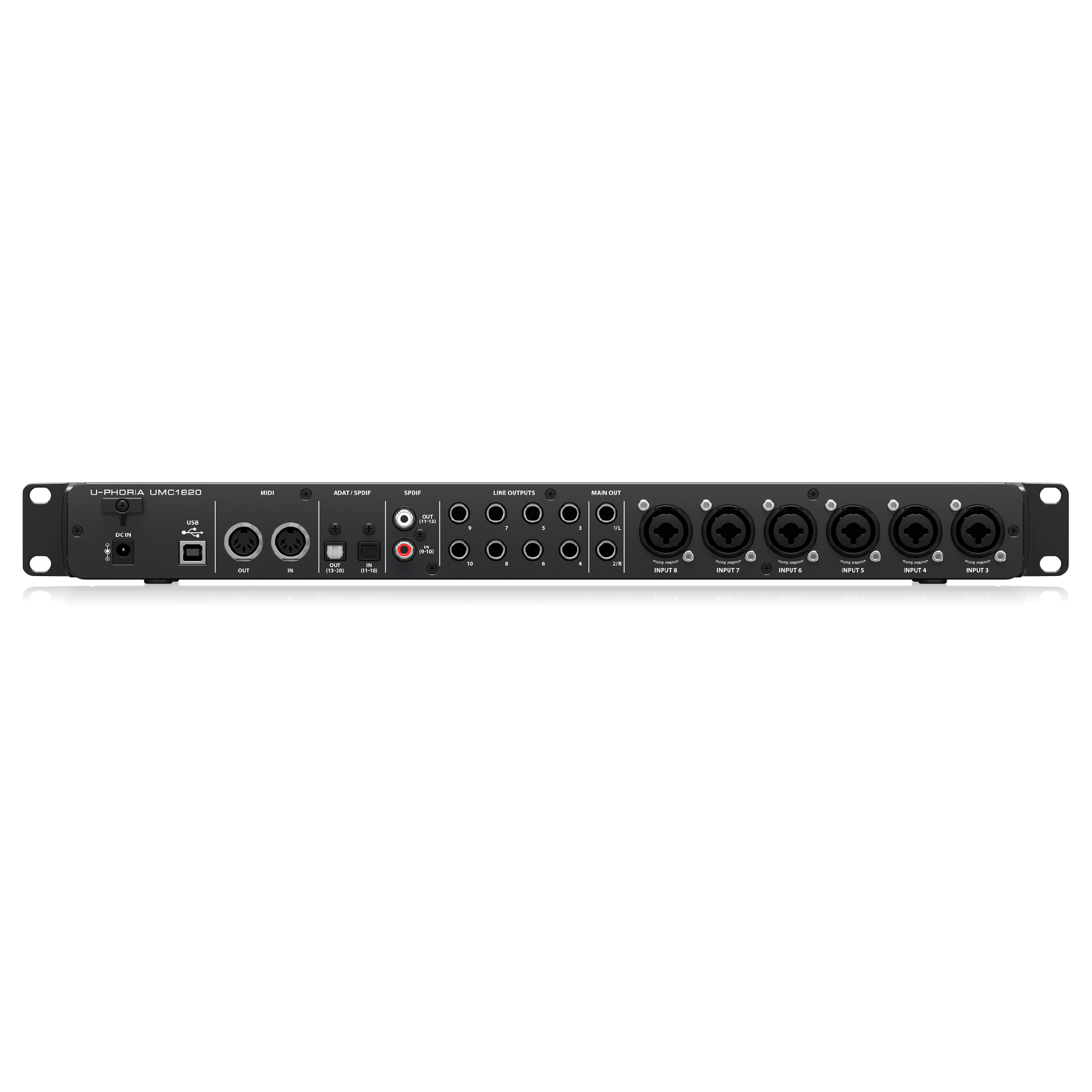 ADAT 入力を使えば、Behringer ADA8200(別売)などを接続して、合計 16 基の Midas 設計マイクプリアンプへ拡張可能。バンド全体にマイキングできます。各演奏者へ個別のヘッドホンミックスを送れるだけの出力も十分。もちろん、UMC1820 は S/PDIF、ADAT、S/MUX、アナログといった標準フォーマットをすべてサポートしています。